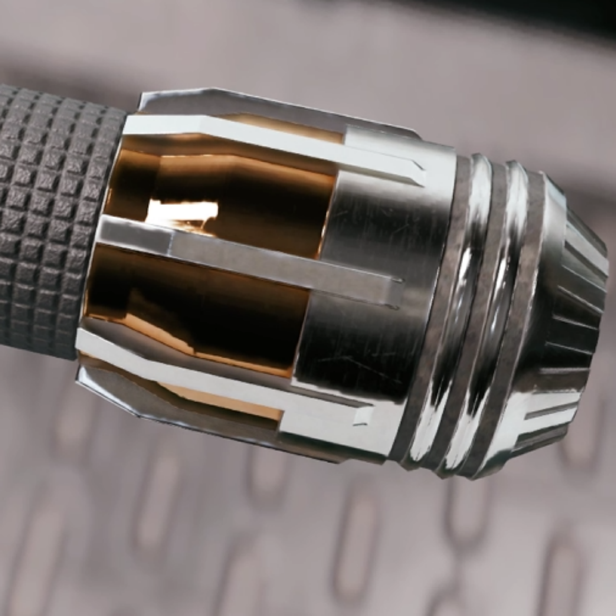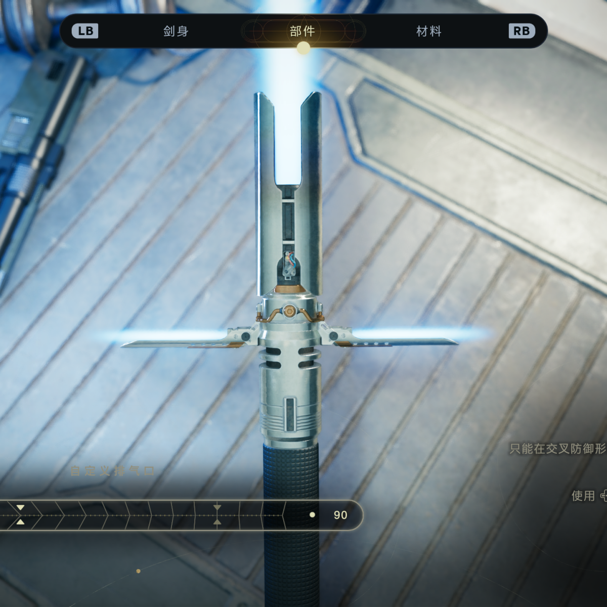 The Vents (Quillons): Unlike traditional crossguards made of physical metal (beskar or phrik), Cal’s guard consists of pure plasma blades. These are generated by two lateral vents located just below the main emitter.